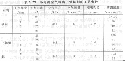 小电流空气等离子弧切割的工艺参数见表6.29。